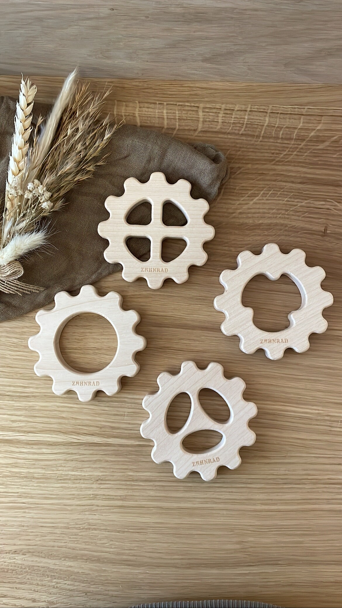 Das Zahnrad ist ein handgefertigtes Holzspielzeug, das speziell für die Zahnung deines Babys entwickelt wurde. Es ist in vier verschiedenen Formen erhältlich die dein Baby zum Zahnen und Entdecken anregen. Der Beißring ist aus natürlichem Holz hergestellt und ist dadurch besonders robust und langlebig.