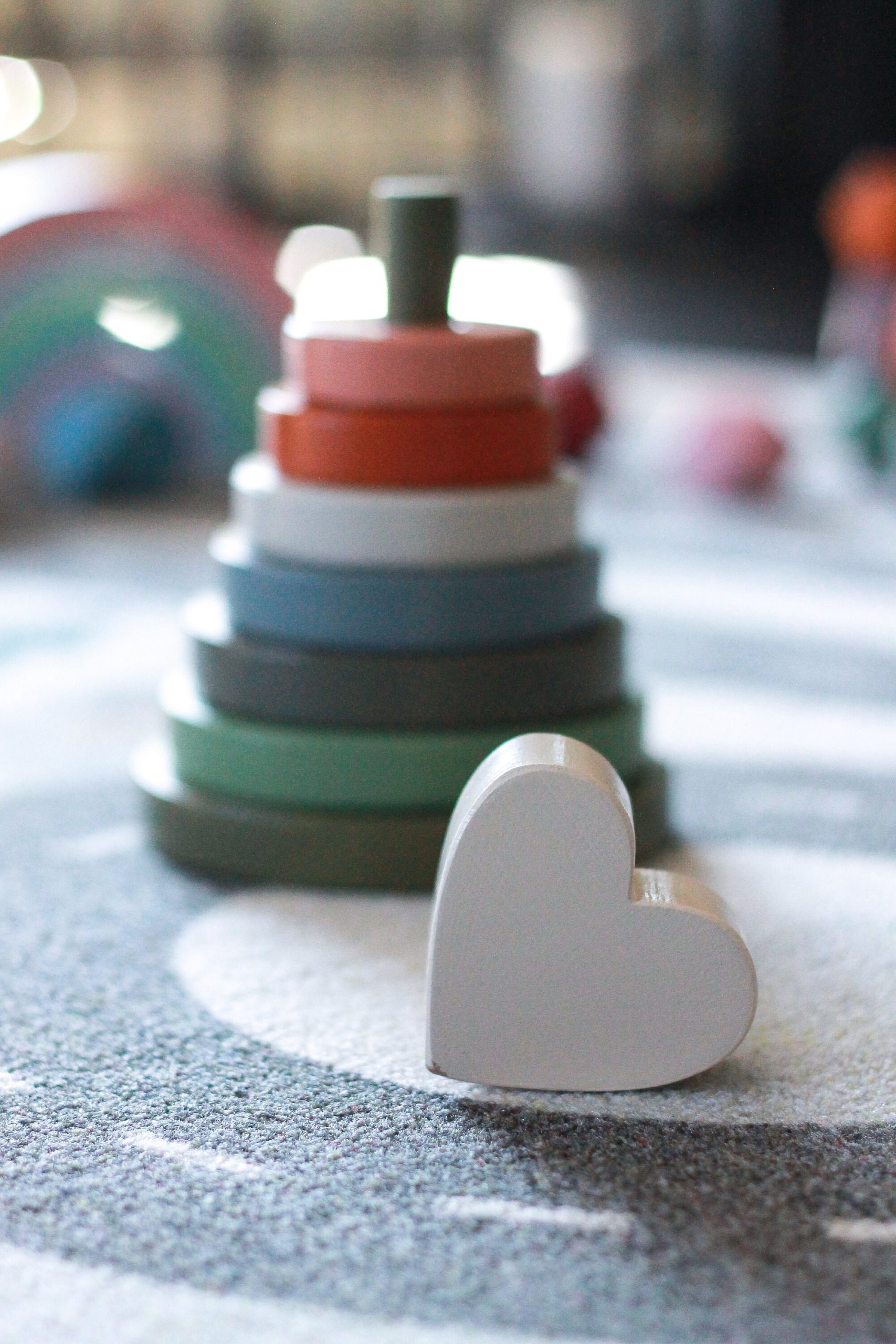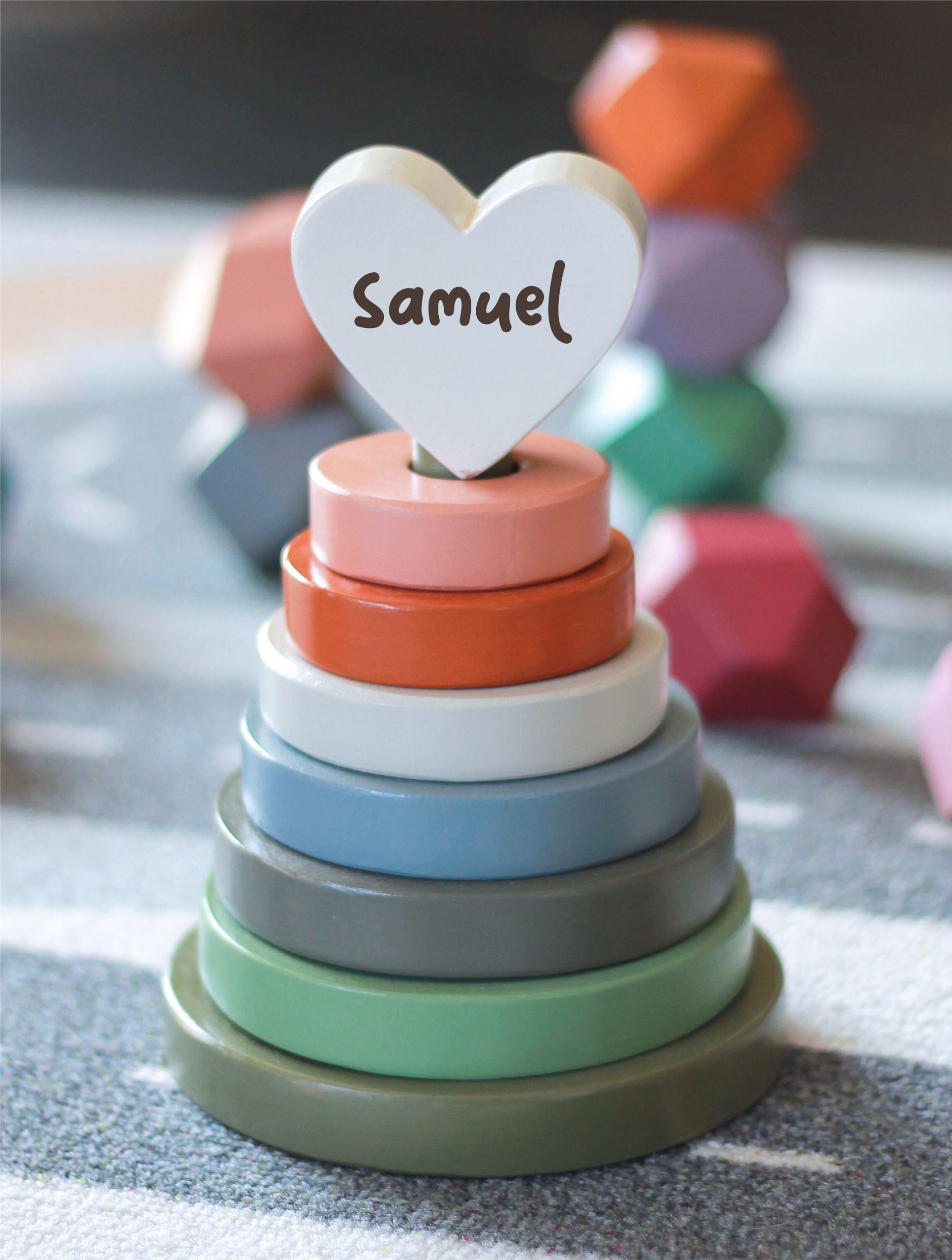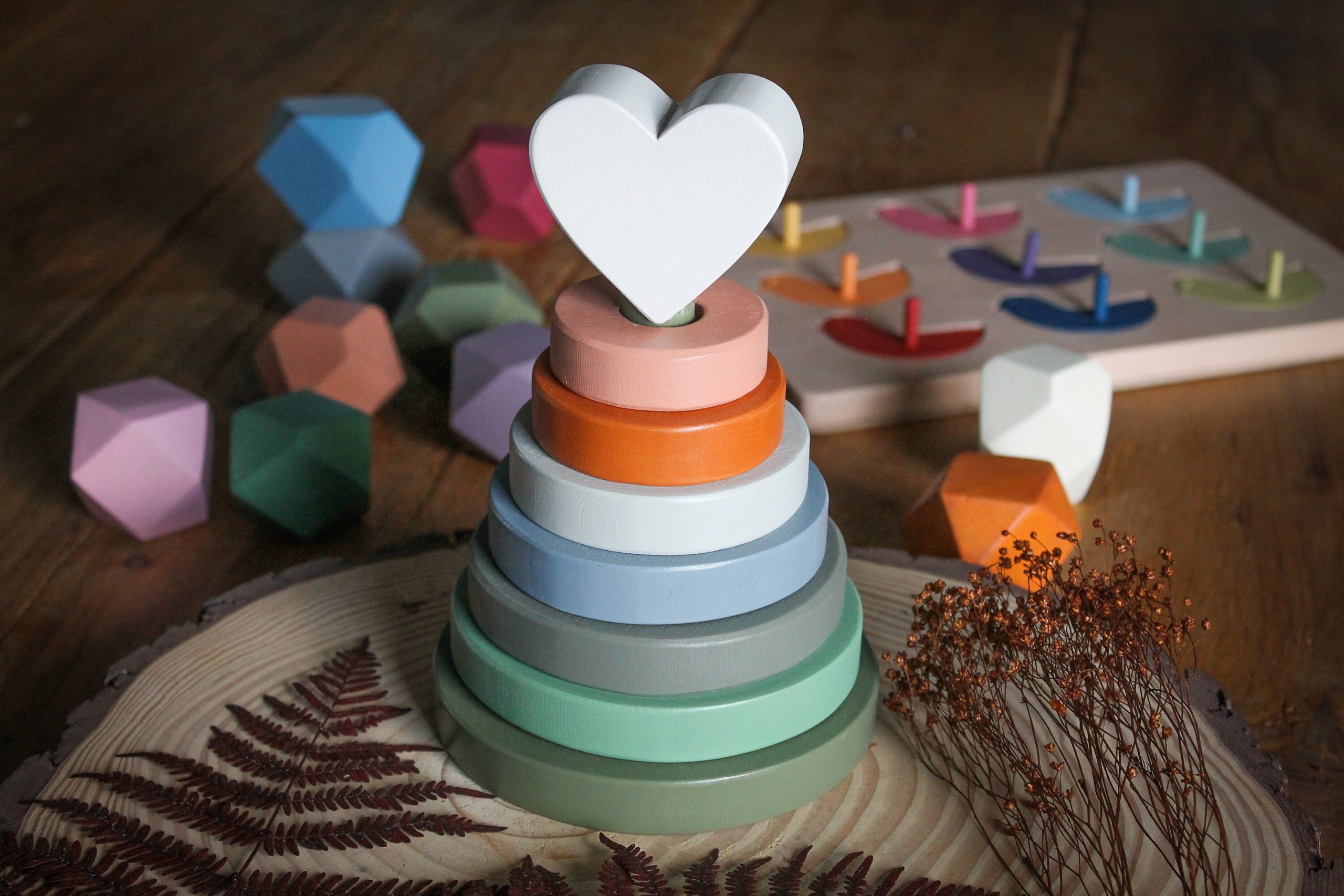 Dieser atemberaubende Herz-Stapler in erdigen Tönen ist die perfekte Ergänzung für jedes Kinderzimmer, auch nur als Dekoration. Er fördert die Auge-Hand-Koordination, die Entwicklung der Feinmotorik und die Unterscheidung der Körpergröße. Kinder werden es genießen, Ringe auf dem Pfosten zu platzieren und sie schließlich in die richtige Reihenfolge zu bringen.