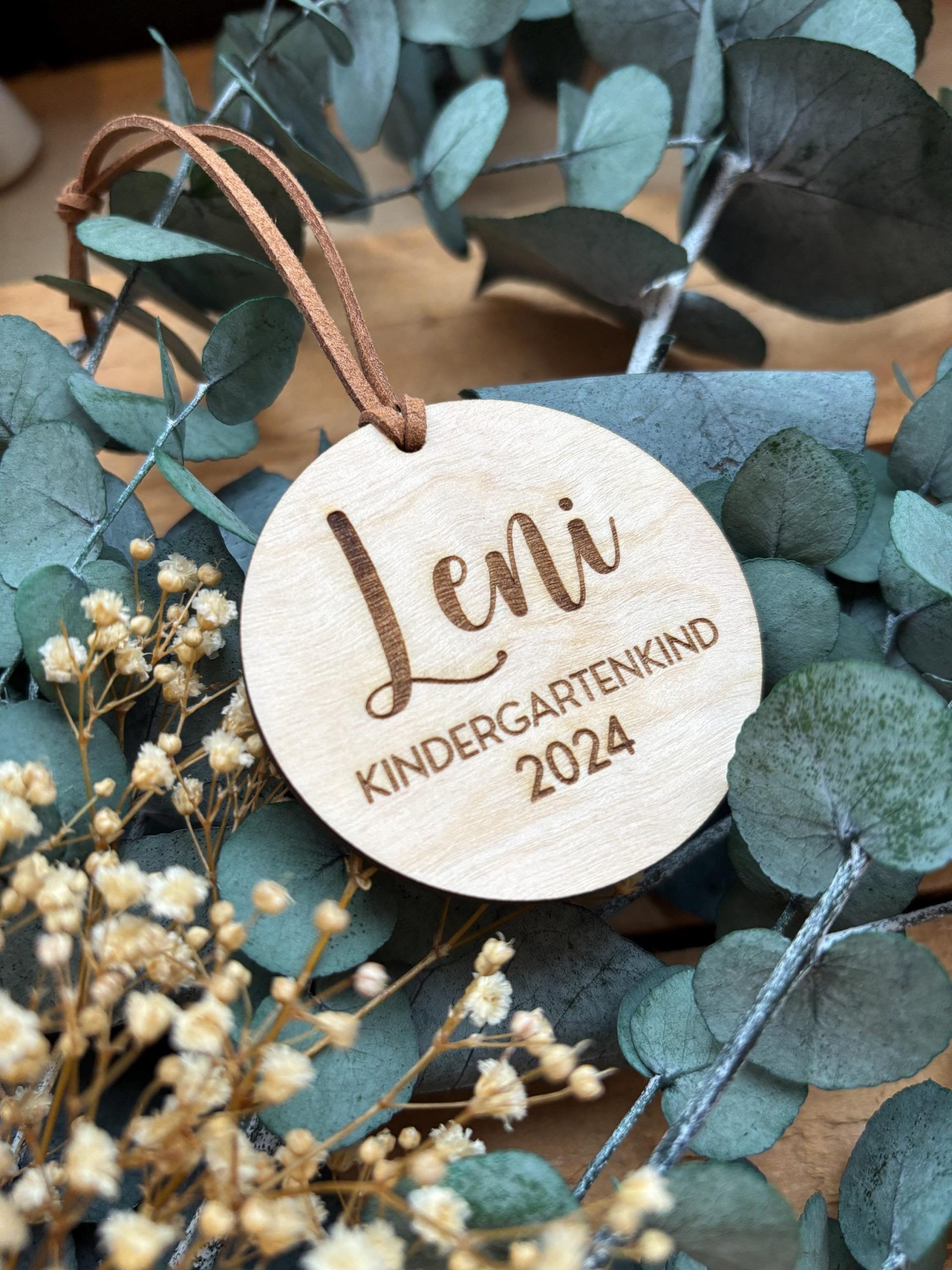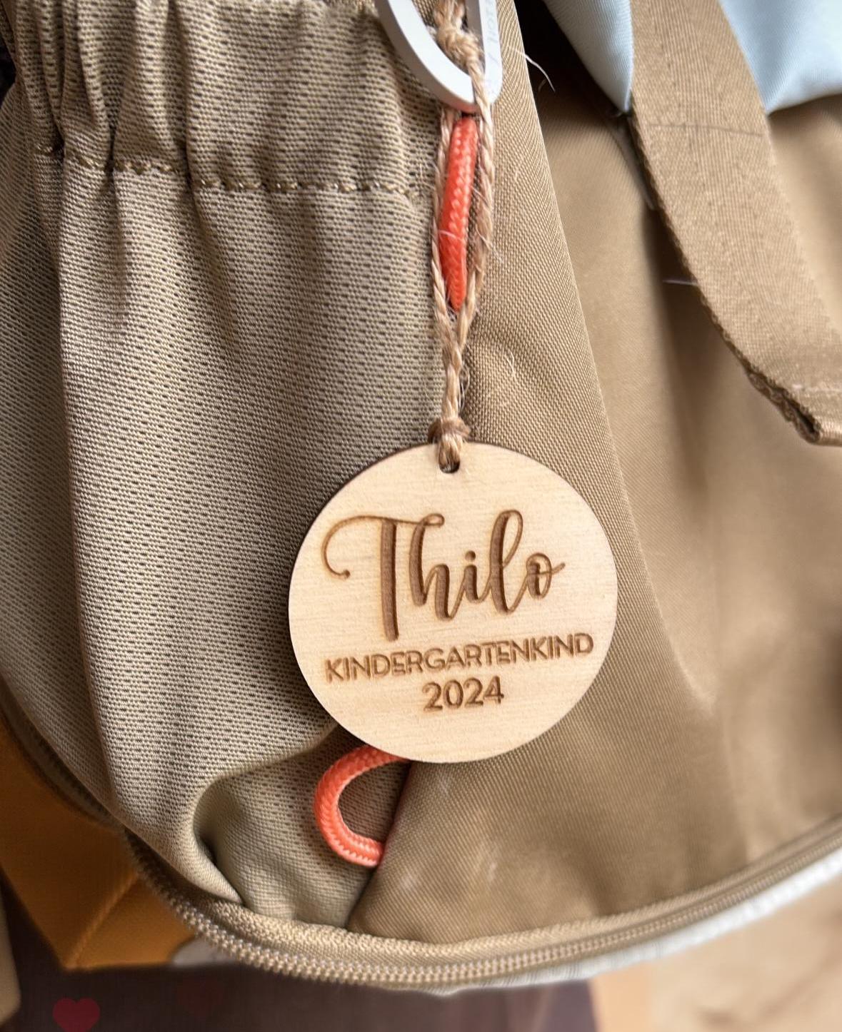 Das Holz lässt sich mit jedem Wunschnamen gravieren und ist ein schönes Geschenk für den Kindergartenstart.