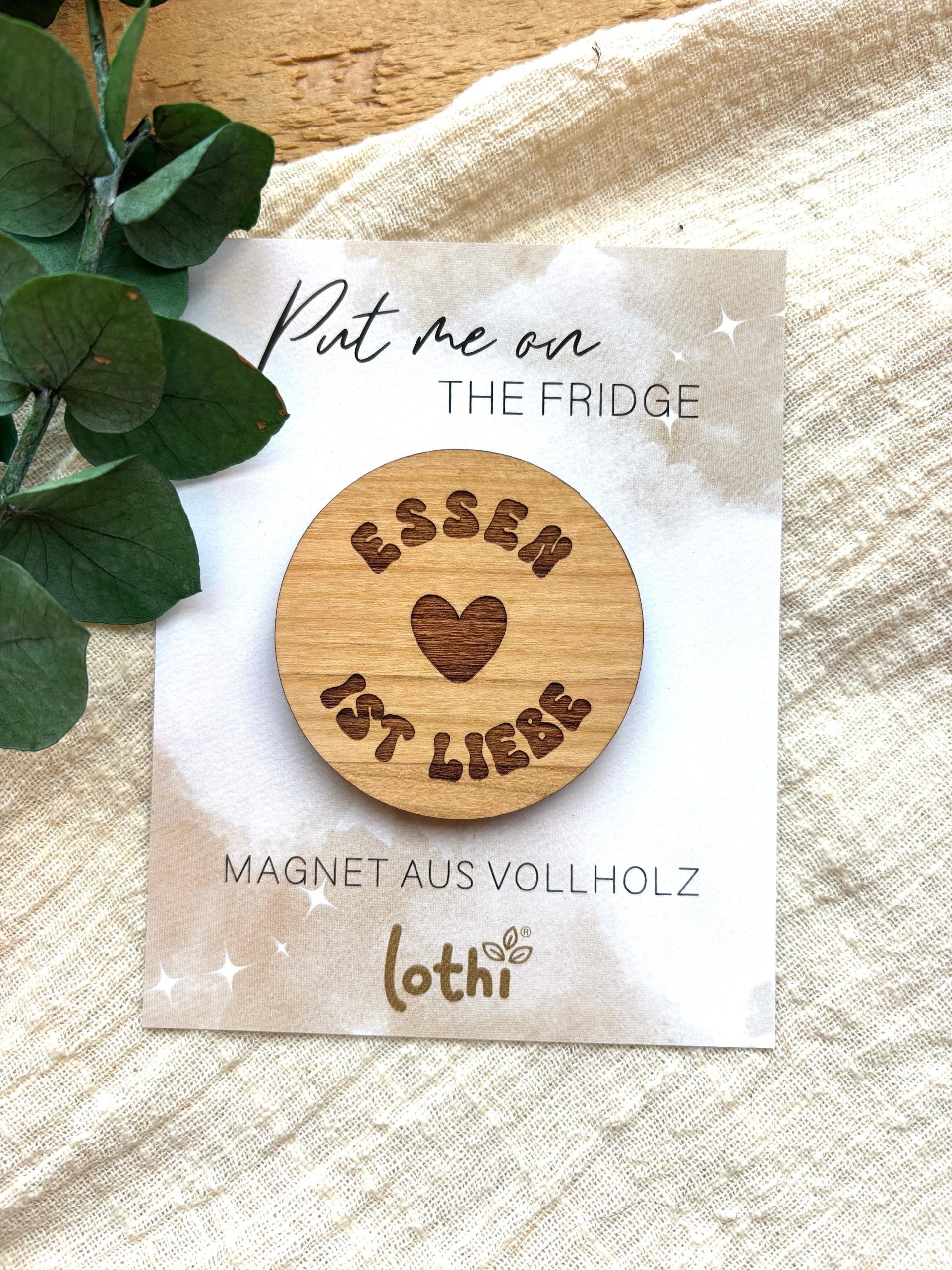 Individueller Holzmagnet mit deinem Text – oben und unten entlang der Rundung graviert.